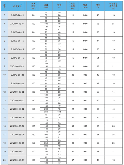 产品概述:QZJ潜水渣浆泵是吸收国外先进技术设计制造。该产品选材精良、结构先进、过流通道宽阔、排污能力强。适合于输送含有沙石、煤渣、尾矿等固体颗粒的液体,主要用于冶金、矿山、火力发电厂等企业渣浆类液体的清除及输送,是传统渣浆泵的理想替代产品。电源为50Hz、380V三相交流电源;介质的**高温度不得高于60℃并不含易燃易暴性气体,介质中固体颗粒的**大体积浓度为30%;**大介质密度为1.2kg/L;机组在介质中以立式工作为好,运行方式为连续运转,当现场条件不符合上述规定时,请在订货时说明,可根据要求定制。