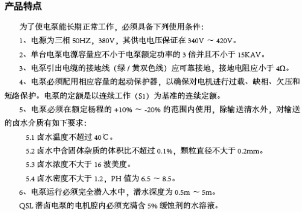 产品概述:QL潜卤水电泵属湿式上泵小型潜水电泵,该泵具有结构简单,体积小,重量轻,运行可靠,寿命长,使用安装方便,且不需泵房等特点,是提取地下水的理想机具。QL产品适用于输送清水和沿海盐场提取卤水或腐蚀性相类似的介质。