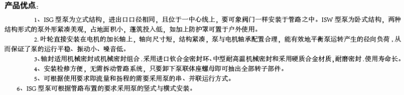 5、ISW型卧式管道离心泵,供输送清水及物理化学质类似于渭水的其他液体之用,适用于工业和城市给排水,高层建筑增压送水,园林喷管,消防增压、远距离输送、暖通制冷循环、浴室等冷暖水循环增压及设备配套,使用温度T<80C 。